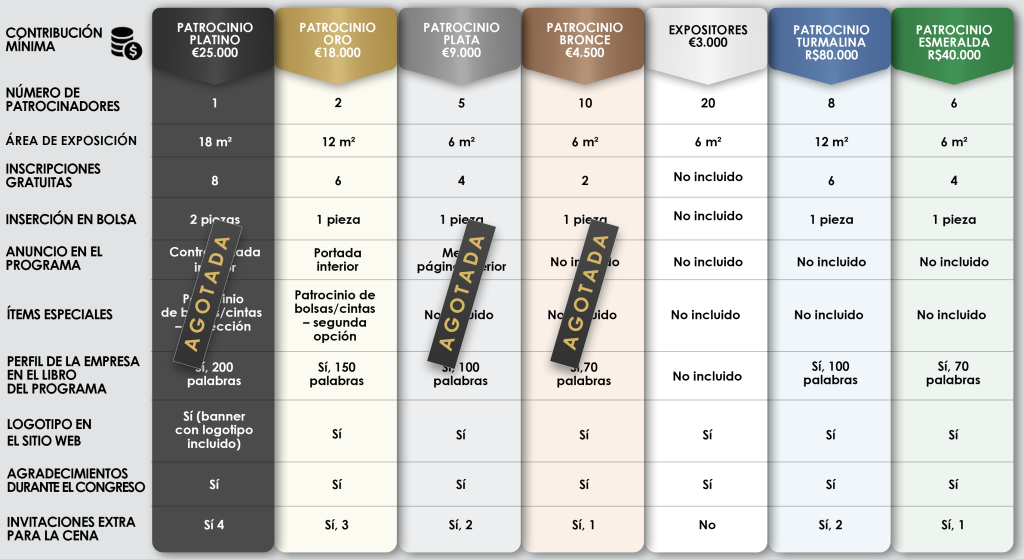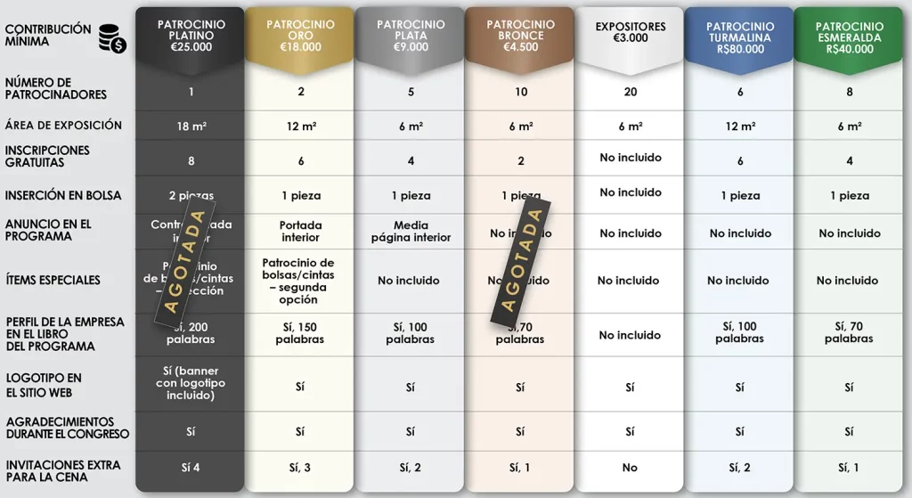 | CONTRIBUCIÓN MÍNIMA (SIN IVA) | PATROCINADOR PLATINO 25.000 € | PATROCINADOR ORO 18.000 € | PATROCINADOR PLATA 9.000 € | PATROCINADOR BRONCE 4.500 € | EXPOSITORES 3.000 € |