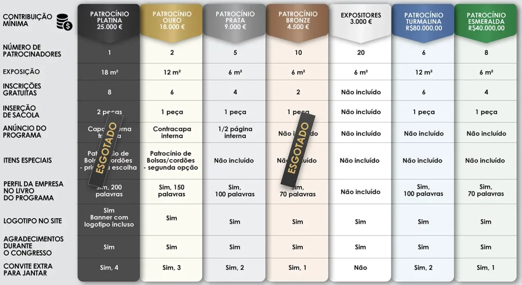 | CONTRIBUIÇÃO MÍNIMA (SEM IMPOSTO) | PLATINUM PLATINA 25.000 € | PATROCÍNIO OURO 18.000 € | PATROCÍNIO PRATA 9.000 € | PATROCÍNIO BRONZE 4.500 € | EXPOSITORES 3.000 € |