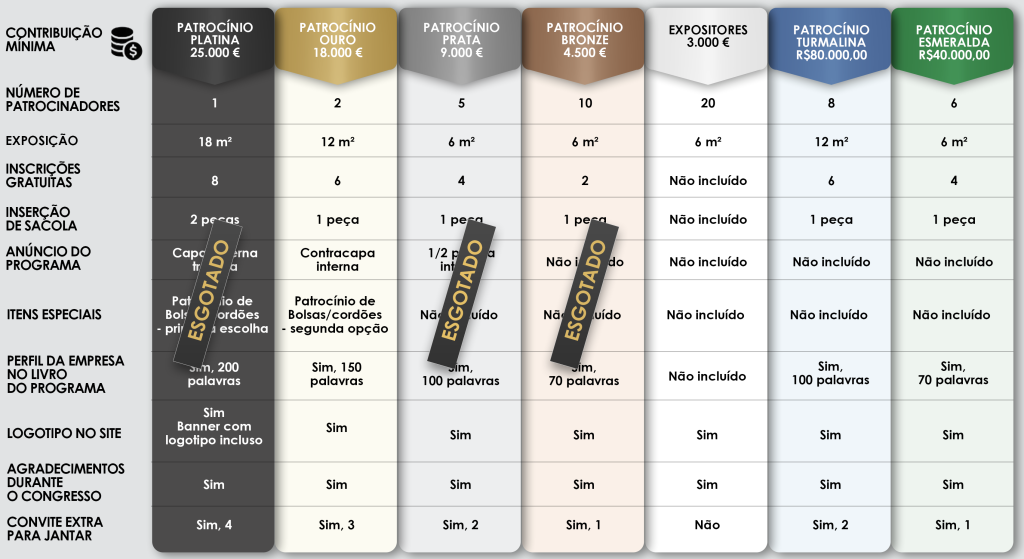 | CONTRIBUIÇÃO MÍNIMA (SEM IMPOSTO) | PLATINUM PLATINA 25.000 € | PATROCÍNIO OURO 18.000 € | PATROCÍNIO PRATA 9.000 € | PATROCÍNIO BRONZE 4.500 € | EXPOSITORES 3.000 € |